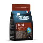 Composition des bouillettes Ail Foie : Farine de maïs, Semoule de blé dur, Farine de soja toasté, Œuf entier en poudre, Farine de soja gras, Poudre de foie de porc, Poudre d’ail, Aliment complémentaire d’allaitement pour veau, Sel, Farine de levure de bière, Chènevis grillé moulu, Poudre de blanc d’œuf de volaille, Huile de saumon, Arôme Ail Foie Cap River.