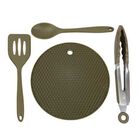 Il comprent une pince pour attraper ou retourner les morceaux de viande, une spatule pour soulever les aliments dans votre poêle, une cuillère pous remuer les plats et servir ainsi qu'un tapis silicone pour poser votre poêle ou casserole dessus afin de ne bruler quelque chose avec la chaleur.
