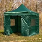 La tonnelle est équipée d’une façade avant amovible avec porte, ainsi que de parois latérales détachables, permettant de moduler l’abri selon la météo ou l’utilisation souhaitée. Les fenêtres PVC intégrées dans les panneaux latéraux apportent de la luminosité tout en conservant une bonne protection contre le vent et la pluie.