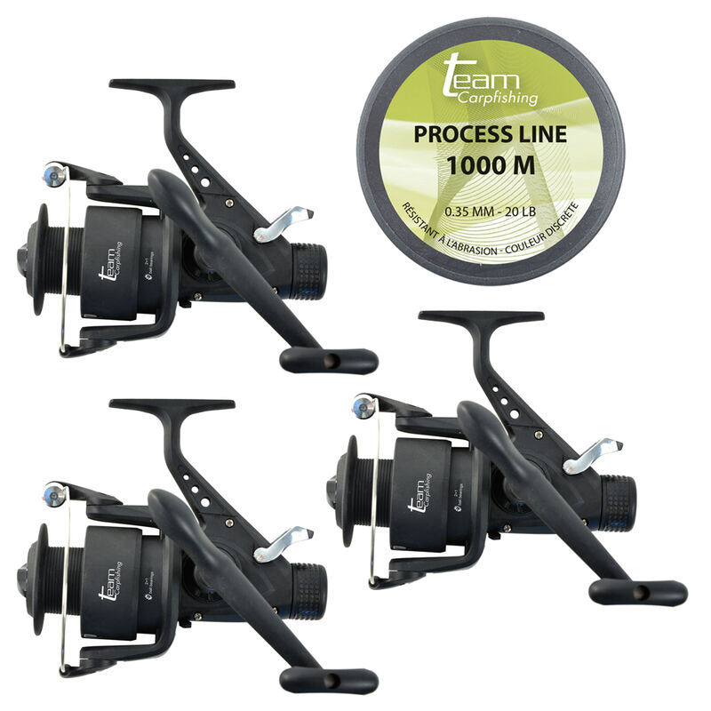 Un pack de 3 moulinet Dark Water 6000 FS débrayable vendu avec une bobine de 1000m de fil process line en 0.35mm.