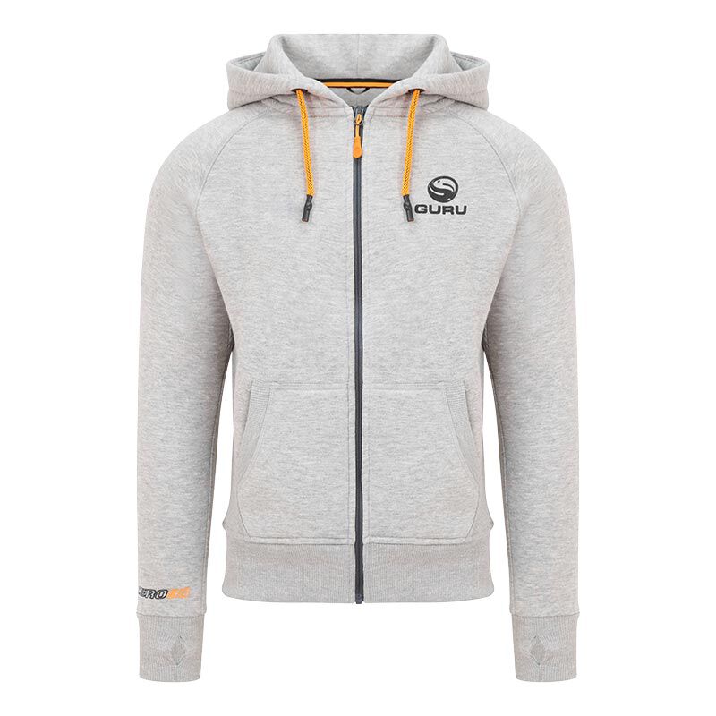 Le Grey Hoodie un sweat à capuche épais et chaud, avec un logo Guru sur le devant et en grand dans le dos. Des boutons à bascule/tireurs orange sur la capuche pour le serrage. Coutures élastiques aux poignets et à l'ourlet. 2 poches.