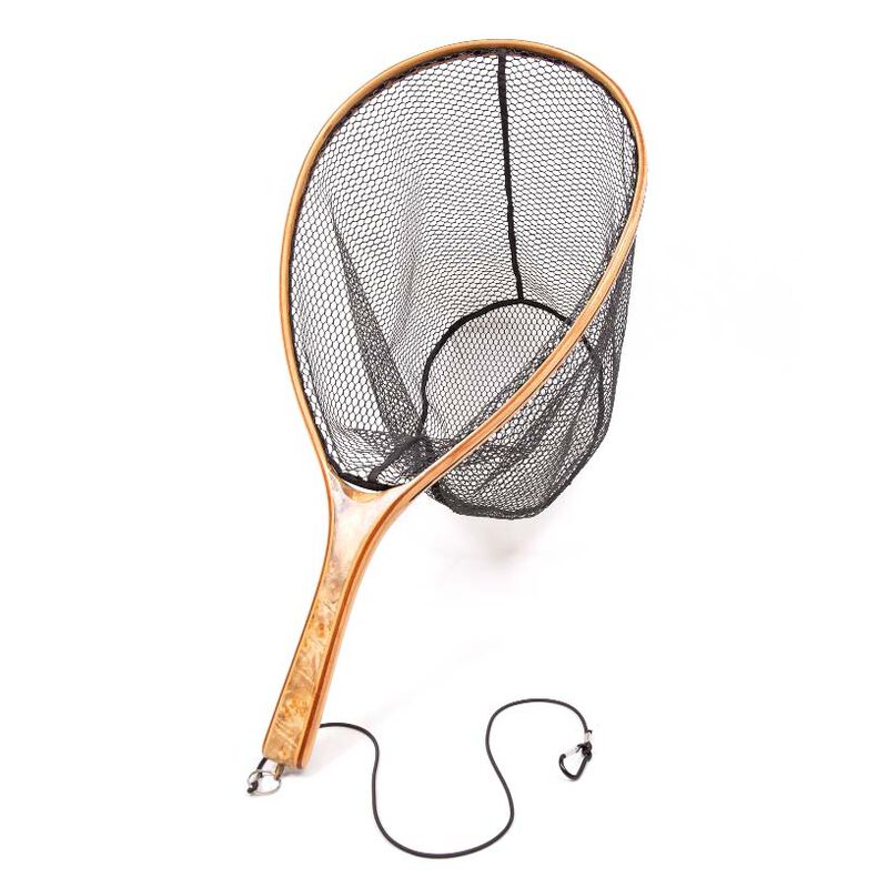 Raquette JMC en bois noble - poignée loupe de bois gravée - filet nylon enduit "rubber" - fond plat.