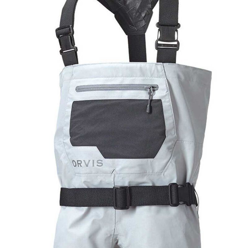 L'aménagement de la partie haute du wader Clearwater permet de stocker quelques bobines et outils avec une boîte à mouche. Il est possible de se réchauffer les mains grâce à la poche kangourou ouverte sur les côtés et doublée d'un fleece chaud à l'intérieur. Ce wader ORVIS peut être converti en pantalon lors des beaux jours.