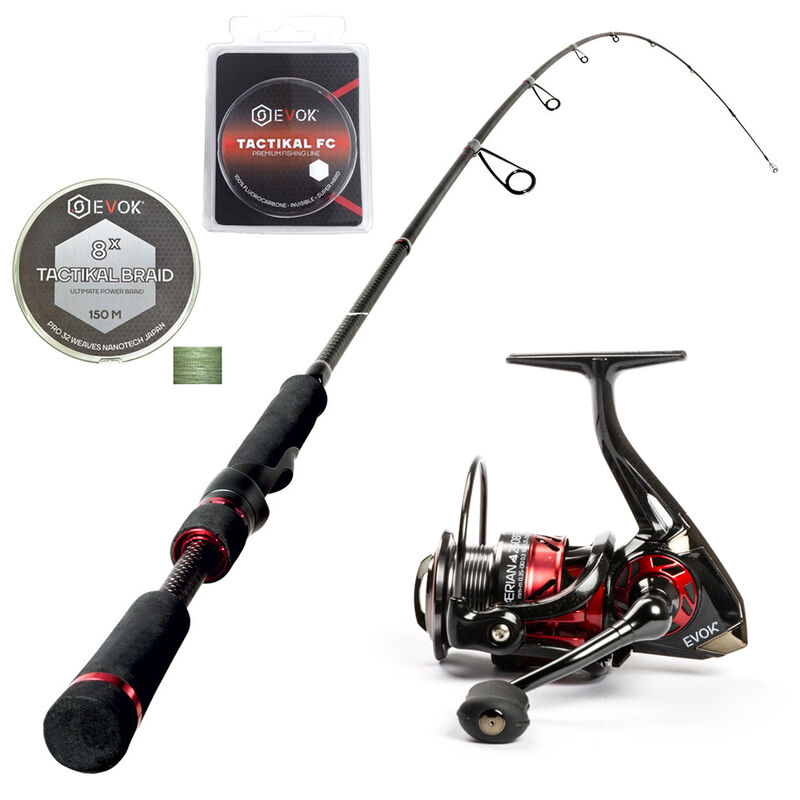 Un pack Evok constitué d'un ensemble pour la pêche au lancer avec une canne Aerian 620MLS, un moulinet Aerian 2508, une bobine de tresse Tactikal et un fluorocarbon Tactikal 0.25mm.