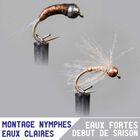 5550-1 : Nymphe de base courbée lourde et classée comme nymphe imitative. Montage perdigone en corps lisse marron avec cerques qui facilite l’immersion complémenté d’un tag noir qui représente un sac alaire et atténue le signal de la bille. Bille en argent pour répondre aux poissons curieux et/ou réactifs. Nymphe d’ensemble proposant un aspect naturel.
