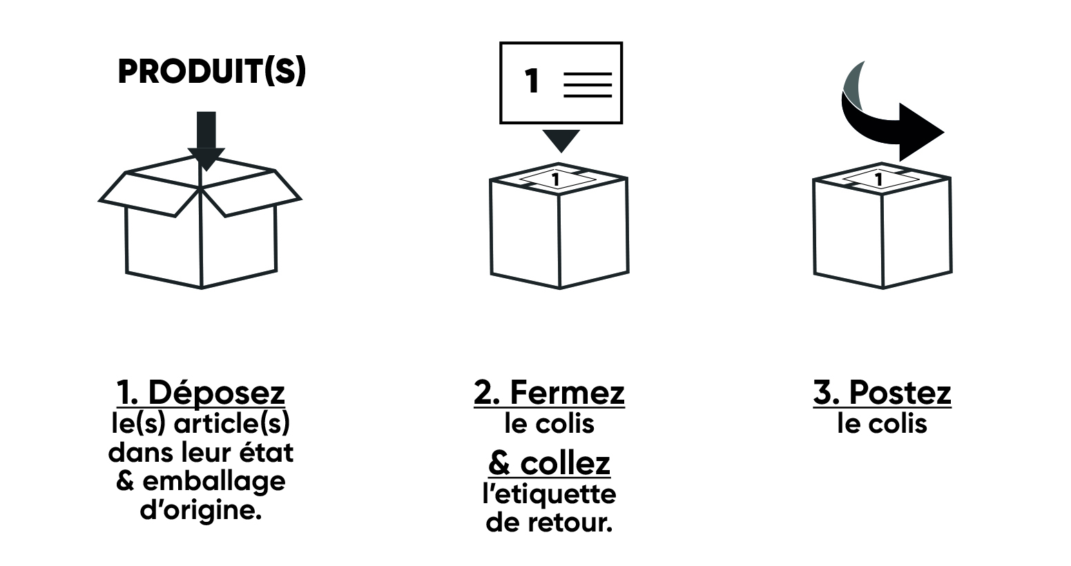 Vous devez emballer les produits avec leur emballage d’origine, coller l’étiquette retour sur votre