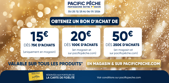*Offre valable du 26 décembre 2025 au 06 janvier 2026, en magasin et sur le site Pacificpeche.com, réservée aux porteurs de la carte de fidélité et/ou détenteurs d’un compte client, sur l’ensemble des produits du panier.
