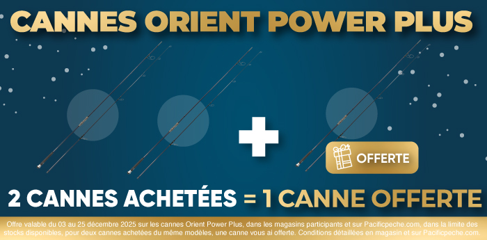 *Offre valable du 03 au 25 décembre 2025 sur les cannes Orient Power Plus, dans les magasins participants et sur Pacificpeche.com, dans la limite des stocks disponibles, pour deux cannes achetées du même modèles, une canne vous ai offerte.Conditions détaillées en magasin et sur Pacificpeche.com.