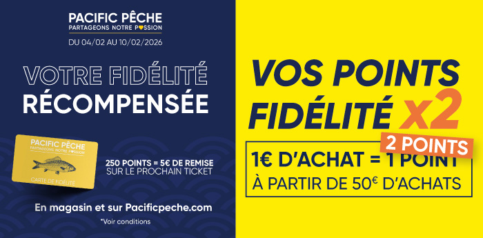 *Offre valable du 04 au 10 février 2026, en magasin et sur le site Pacificpeche.com, sur l’ensemble des produits du panier. Les points de fidélité sont automatiquement doublés dès 50€ d’achats. Le montant d’achat est calculé hors cartes cadeaux et prestations SAV. Le montant d’achat pris en compte pour le doublement des points de fidélité correspond au montant effectivement payé, après déduction des points de fidélité utilisés. Le doublement des points est attribué selon le montant final des achats conservés. En cas de retour d’un ou plusieurs articles, le doublement pourra être annulé ou ajusté en conséquence.